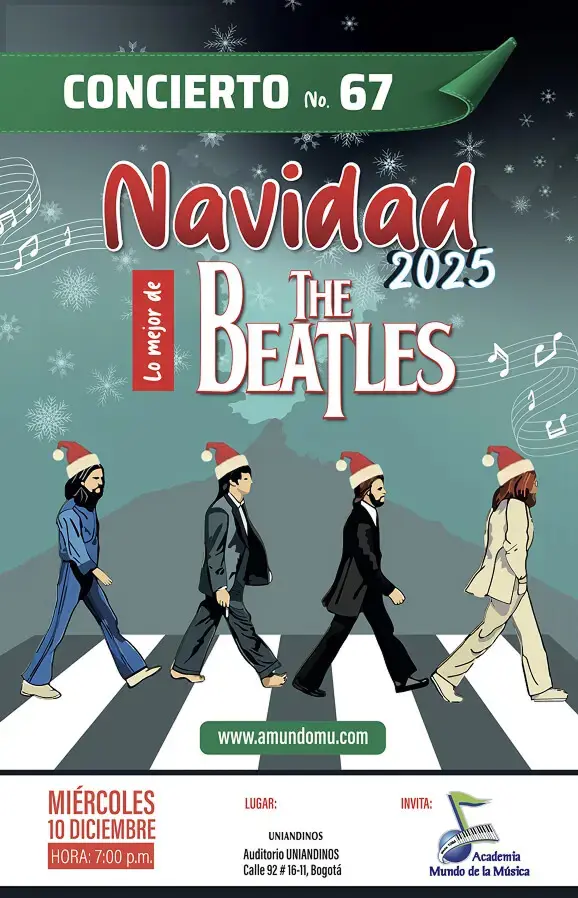 ¡Únete a nuestro Concierto Especial de Navidad 2025 #65! Vive una noche mágica con temática Tributo a The Beatles en Bogotá. Disfruta de los clásicos inolvidables como ‘Day tripper’ y ‘Something’ en un ambiente festivo y navideño. ¡No te lo pierdas!